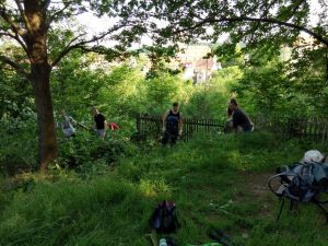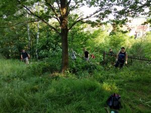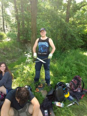 Oben angekommen merkten wir schnell, dass kurze Hosen nicht die geeignete Kleidung für solch einen Einsatz sind. Trotzdem stellten wir uns den Prüfungen unseres "Dschungelcamps". Die Brombeerranken wehrten sich vergeblich, gegen die Machetenschläge von Hannes, Max und Noah hatten sie keine Chance. Aber die dickeren Stämme erforderten schon mehr Energie. Also ran ans Unterholz! Das hängige Gelände machte es nicht leichter, doch Johann, Johanna und Mick ließen sich nicht abschrecken. Mit Baumsäge, Astschere und Beil kämpften sie sich voran, bei der Hitze ein schweißtreibendes Unternehmen. Johann entpuppte sich als Kletterkünstler und widmete sich bevorzugt den höheren Ästen. Dabei wurde so einigen klar, was Hebelgesetz und Biegespannung in der Praxis bedeuten, dass man beim Sägen schon darauf achten sollte wo man ansetzt und was es heißt wenn "die Säge klemmt".