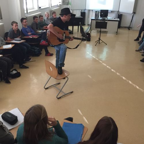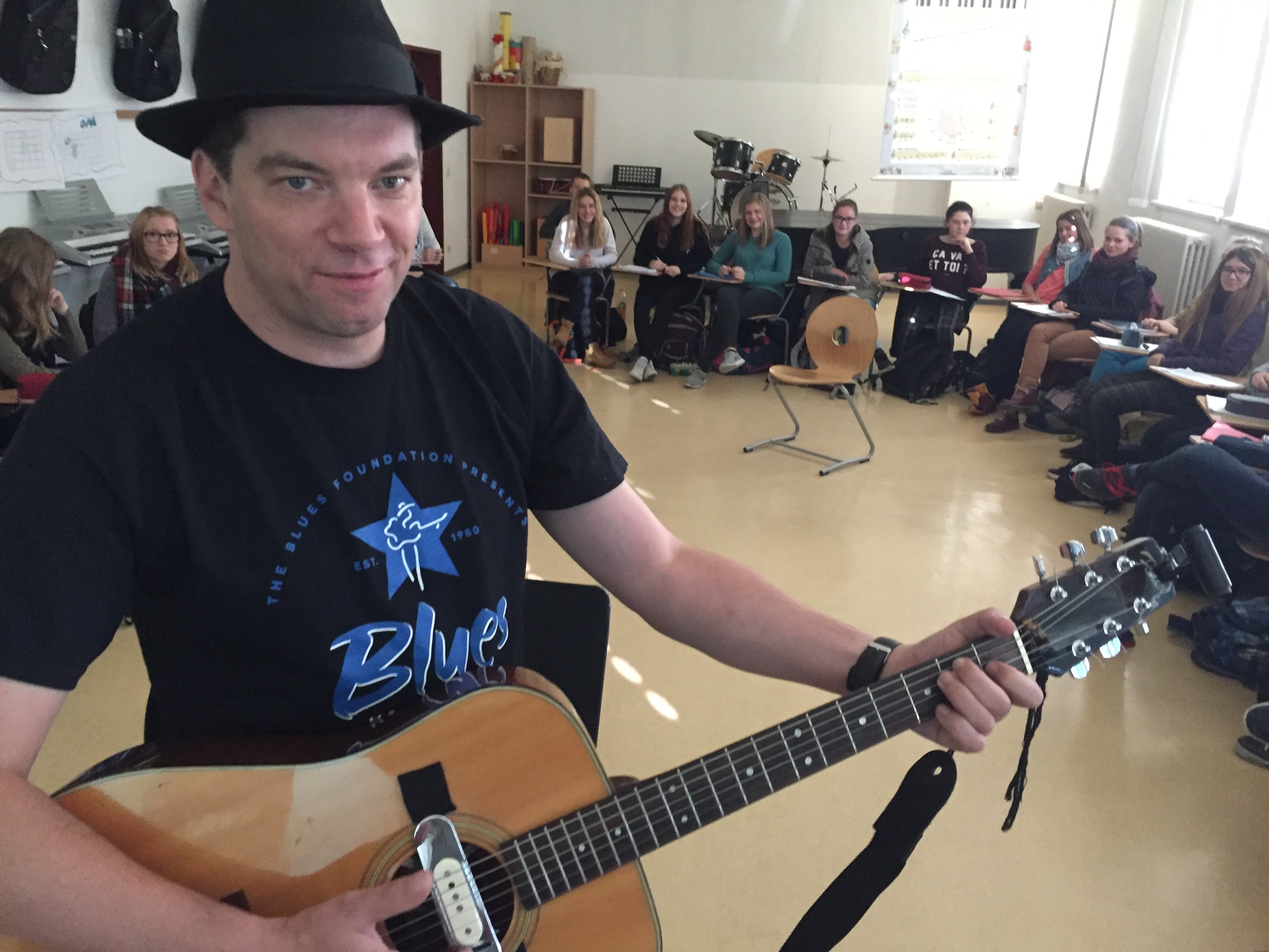 Im Musikunterricht zeigte er sein Können und erzählte von seiner letzten Reise nach Memphis und ins Mississippi-Delta. Die Schüler bekamen allerlei Wissenswertes zum Ursprung der Blues Musik und den verschiedenen Spielweisen und Instrumenten zu hören. Erstaunt waren viele darüber, wie sehr doch der Blues unsere moderne Popmusik geprägt hat und dies immer noch tut. Wer ihn Live erleben möchte, hat dafür noch am 04.11. auf Burg Mildenstein (Leisnig) oder am 06.11. im Brauhof Freiberg die Möglichkeit.