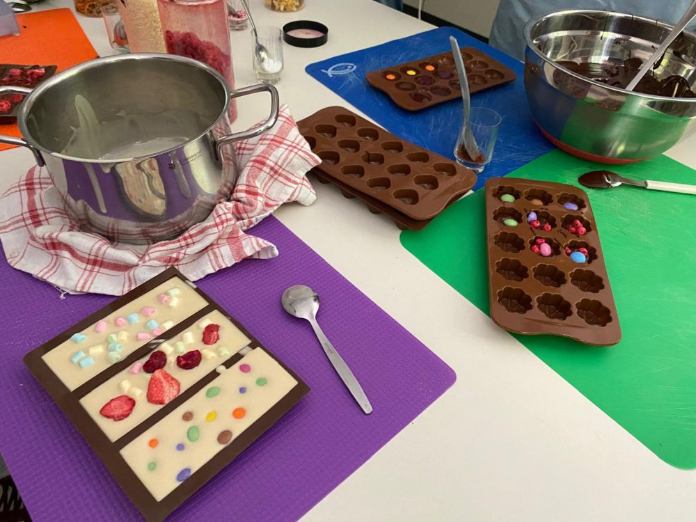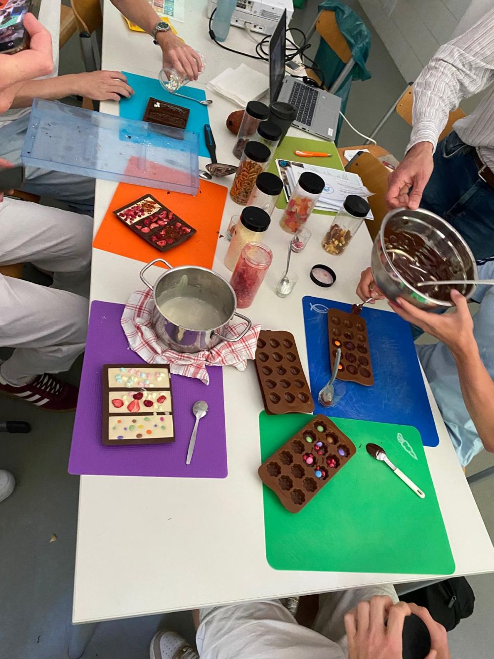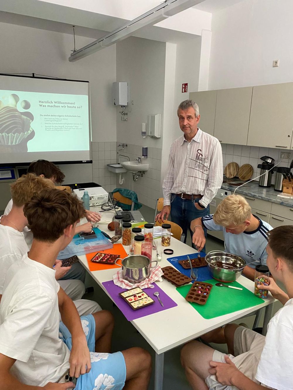 An Station Nummer 2 wurde es schokoladig. Wir durften unsere eigene Schokolade herstellen und haben nebenbei viel über den Weg der Kakaofrucht bis zur Schokolade gelernt. Auch wurde uns viel über Fair Trade- Schokolade und über Unterschiede zu Schokolade ohne Siegel erklärt. In einem kurzen Rollenspiel mussten wir uns außerdem in die Lage der Kakaobauern hineinversetzen.
