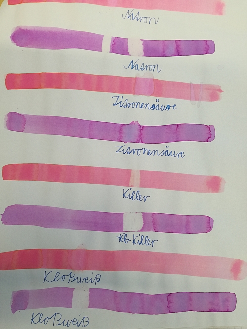 Es ging um Untersuchungen verschiedener Tinten mit diversen Substanzen wie Iod-Salbe, „Kloß-Weiß“, Natron oder Zitronensäure. Dazu waren Protokolle anzufertigen und einzureichen.
