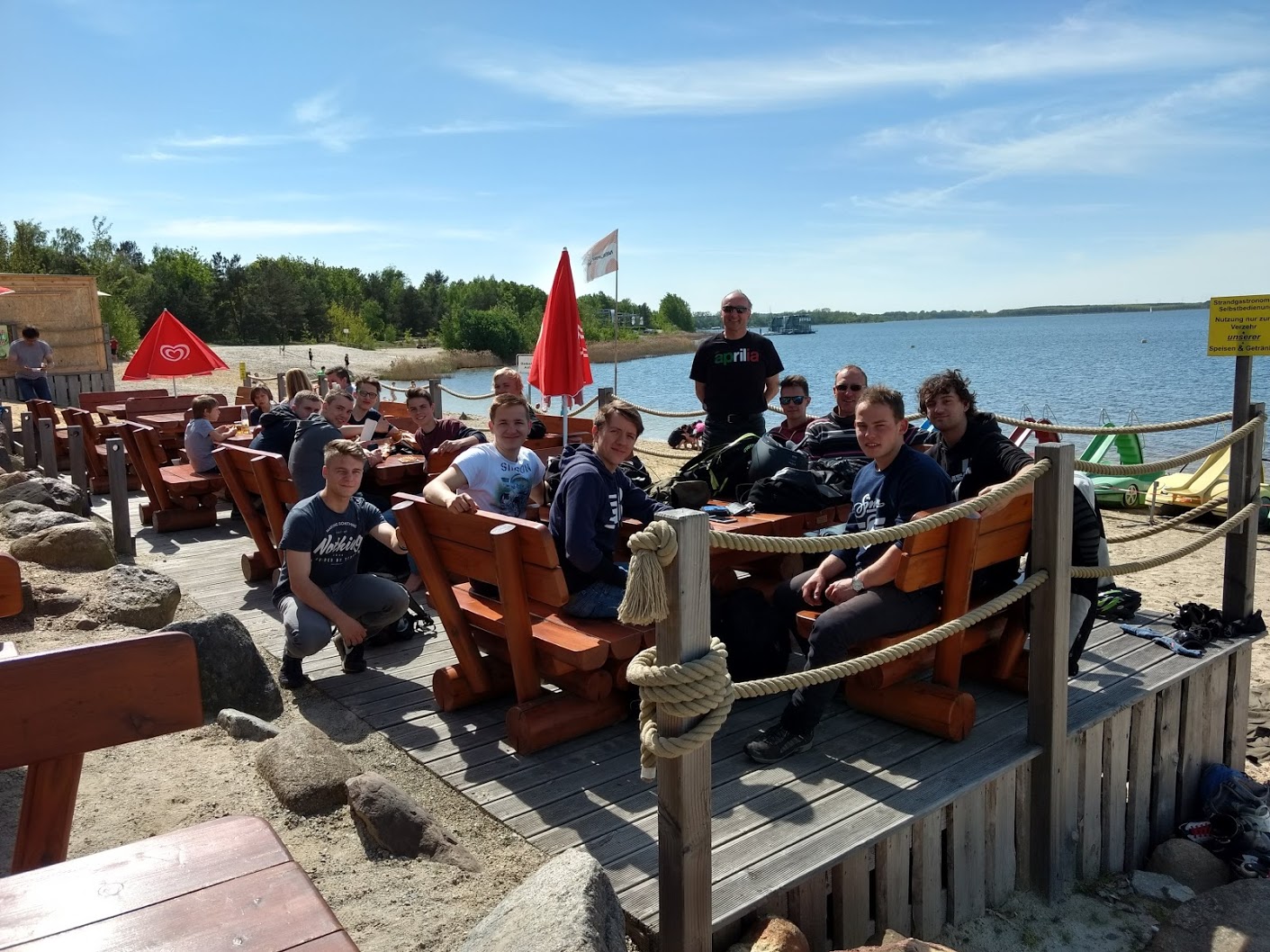 Gegen ein Uhr erreichten wir den Geierswalder See. Da sollte dann auch unser Umkehrpunkt sein. Einige nutzten die Chance und suchten nach einem Zeltplatz für den nächsten geplanten Trip dahin. Ansonsten genossen wir die Sonne in der Strandbar mit Eis, Cola und Kaffee. Neun von uns mieteten sich ein Tretboot mit Rutsche und tatsächlich: zwei von den Kerlen schwammen bei gefühlten 15 Grad Wassertemperatur auch noch eine Runde ums Boot. Respekt!