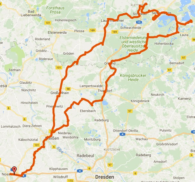 So nach einer Stunde brachen wir auf. Wir wollten noch einmal den Lausitzring besuchen. Aber eine Einfahrt nach der anderen war gesperrt, die DEKRA hatte das Areal ringsrum dicht gemacht. Na dann eben weiter nach Hause. Der Rückweg führte über Lauchhammer und Hirschfeld am Schradenwald. In Hirschfeld drehten einige noch eine Runde auf der Crosstrecke. Irgendwo in der Prairie sagte das Navi "geradeaus" obwohl nur ein besserer Feldweg zu sehen war. Na macht nix, die eine abgefallenen Packtasche hatten wir schnell wieder dran.