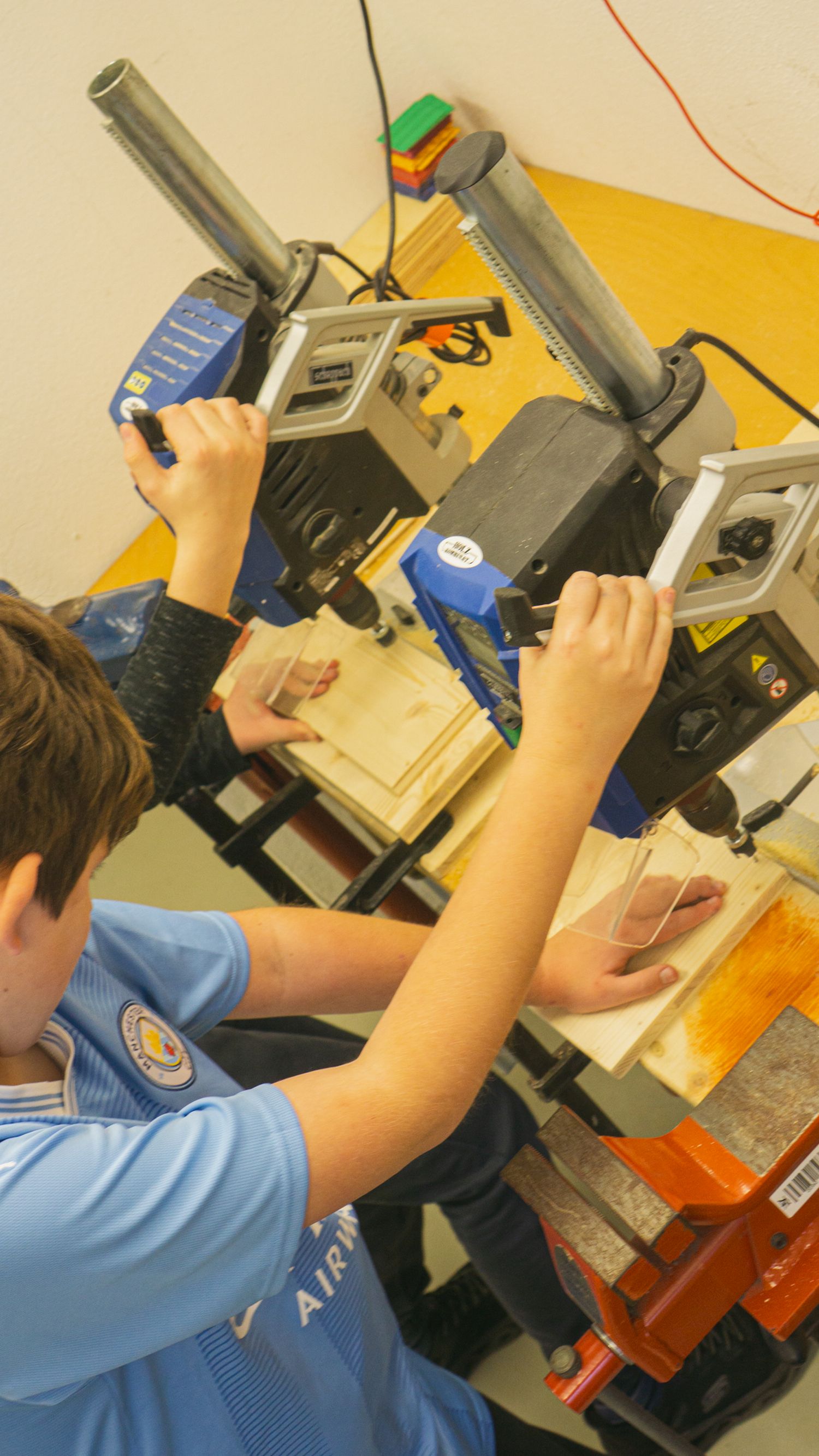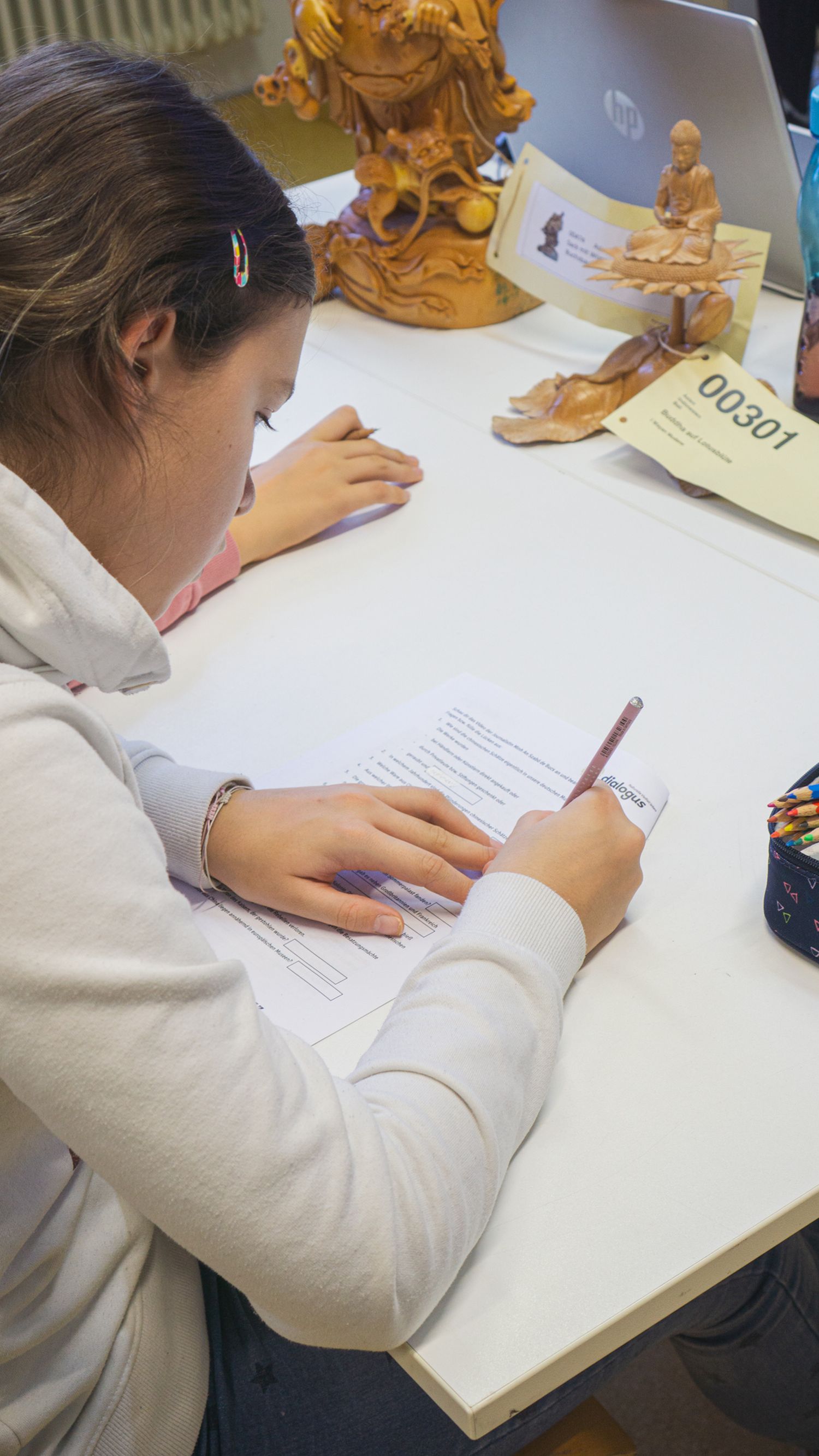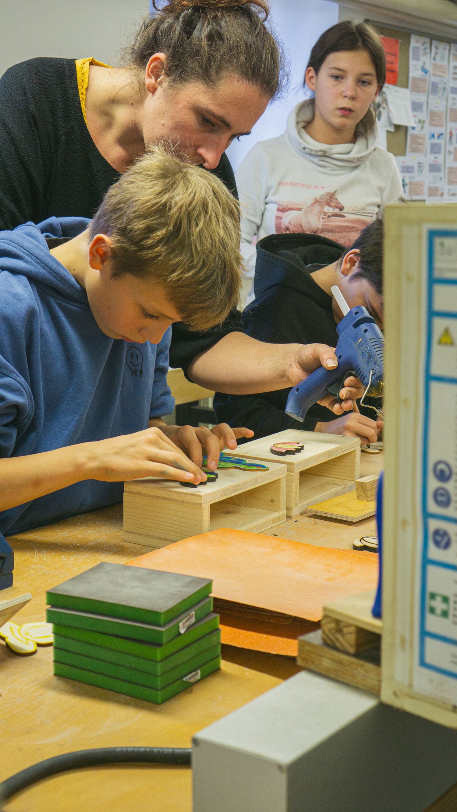 Der Projekttag setzte sich aus 4 Stationen zusammen, an denen die Schülerinnen und Schüler der 6. Klasse verschiedene Aspekte der chinesischen Kunst und Kultur kennenlernen konnten. So begleitete im Werkraum ein Team der Projektwerkstatt Holzkombinat die Lernenden bei der Herstellung einer Holz-Schatulle und der Verzierung mit einer Buddha-Figur auf einer Lotusblüte. Dazu wurden in einer ersten Station alle Bauteile von den Kindern selbst abgeschliffen, gebohrt, geklebt und zusammengeschraubt. Die Verzierungen wurden dann in einer zweiten Station individuell gestaltet und auf dem Deckel der Schatulle angebracht.