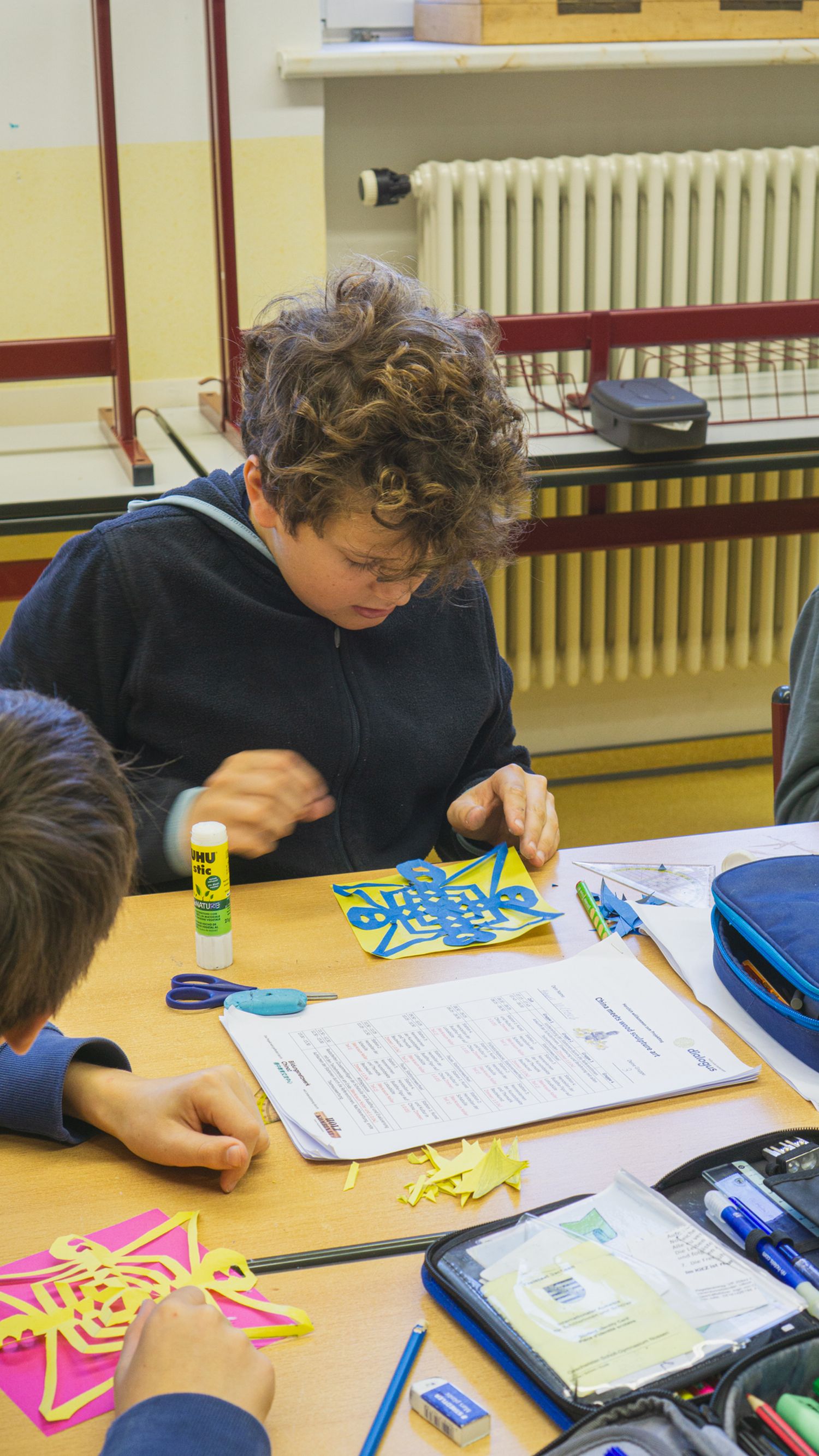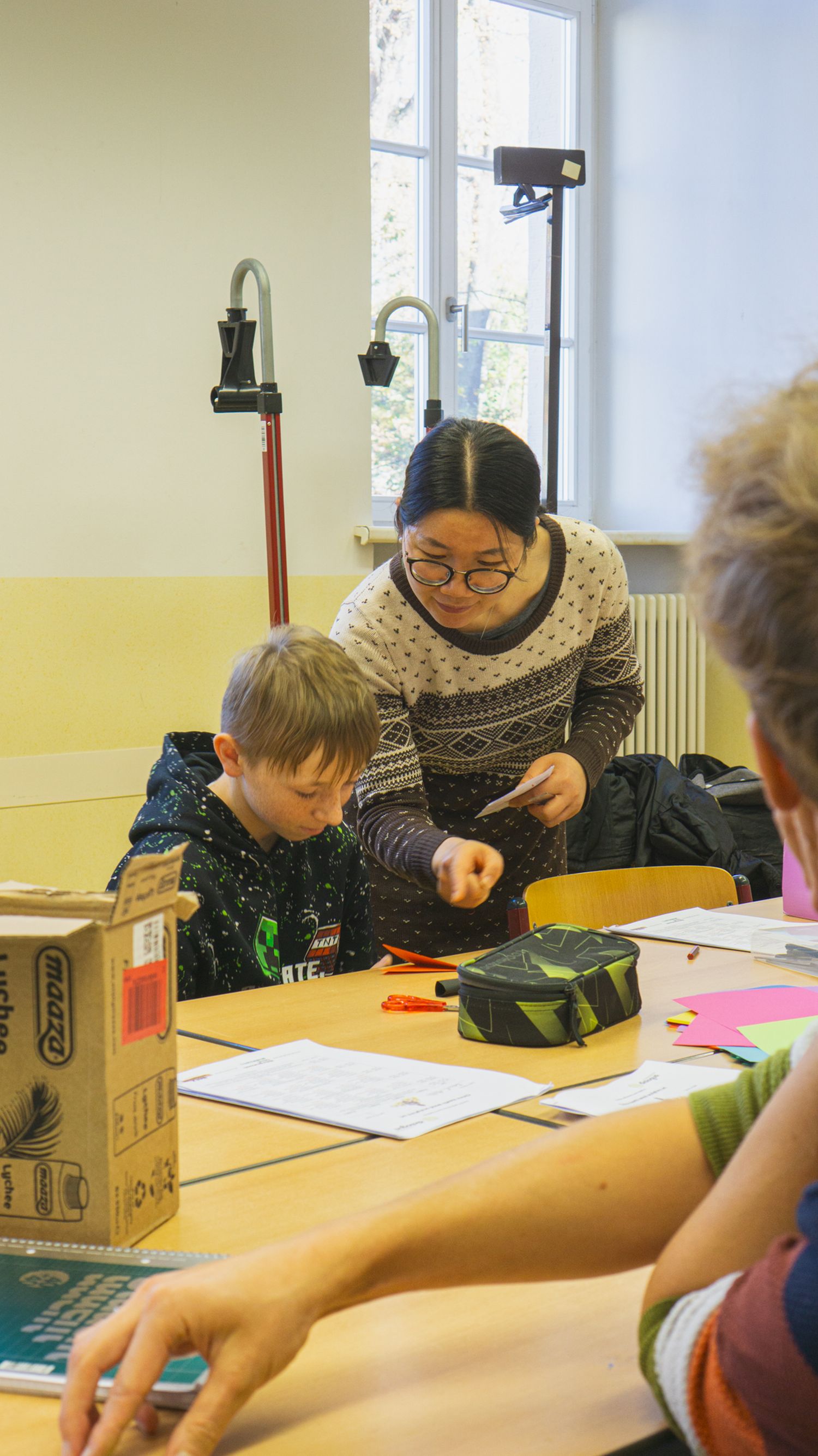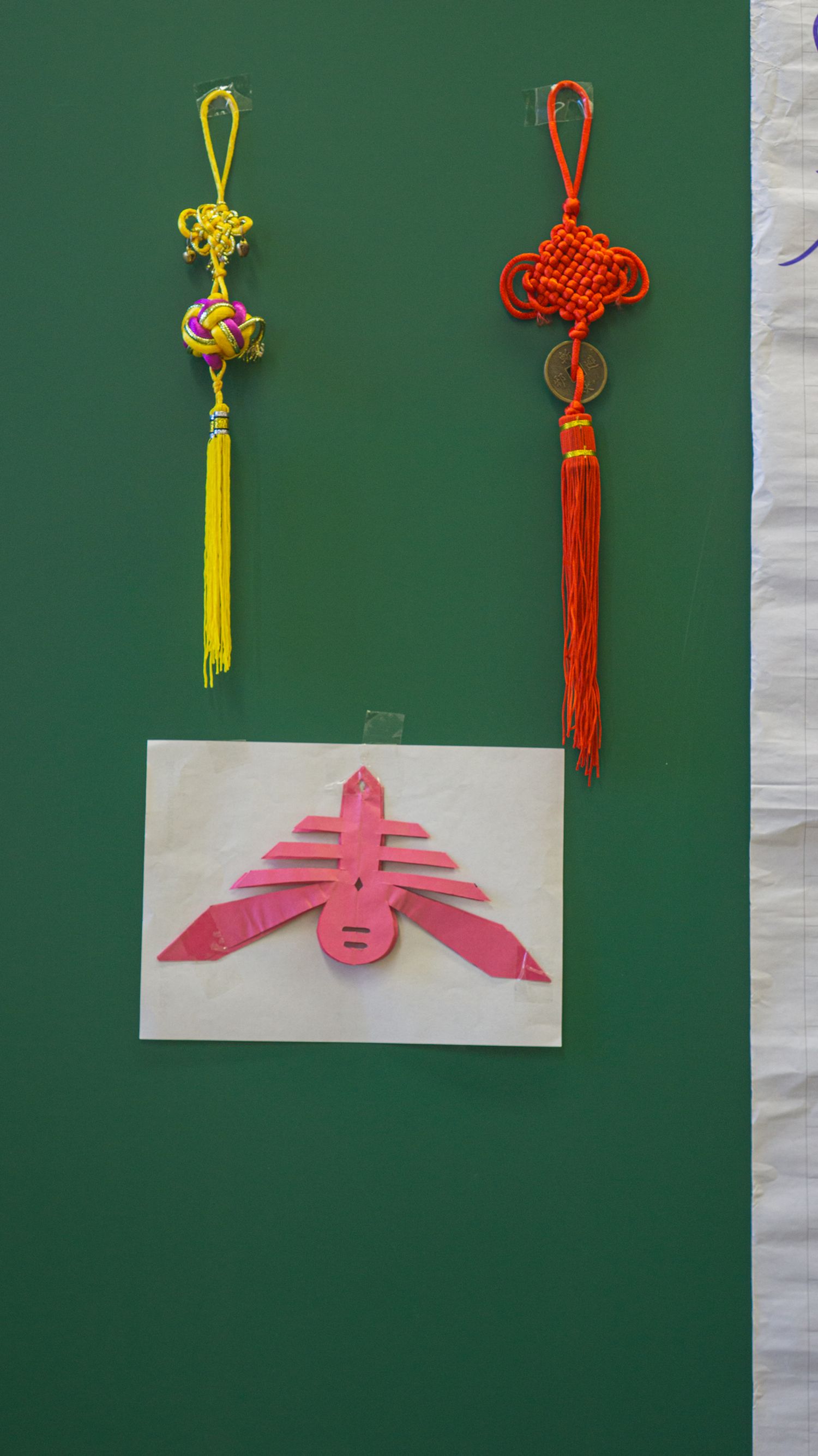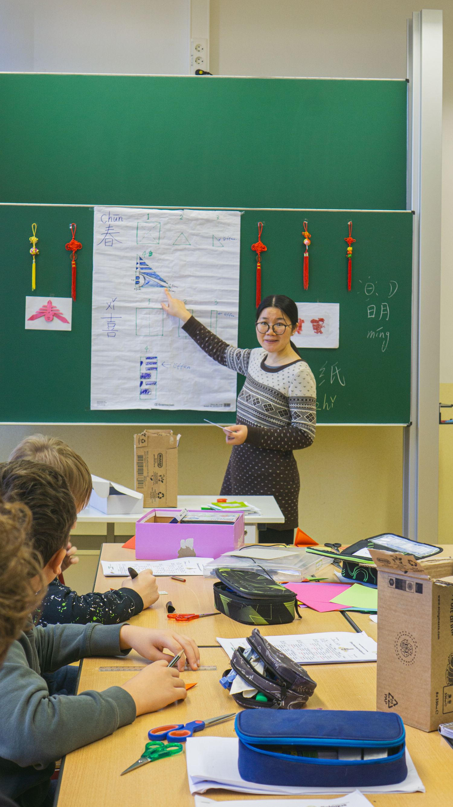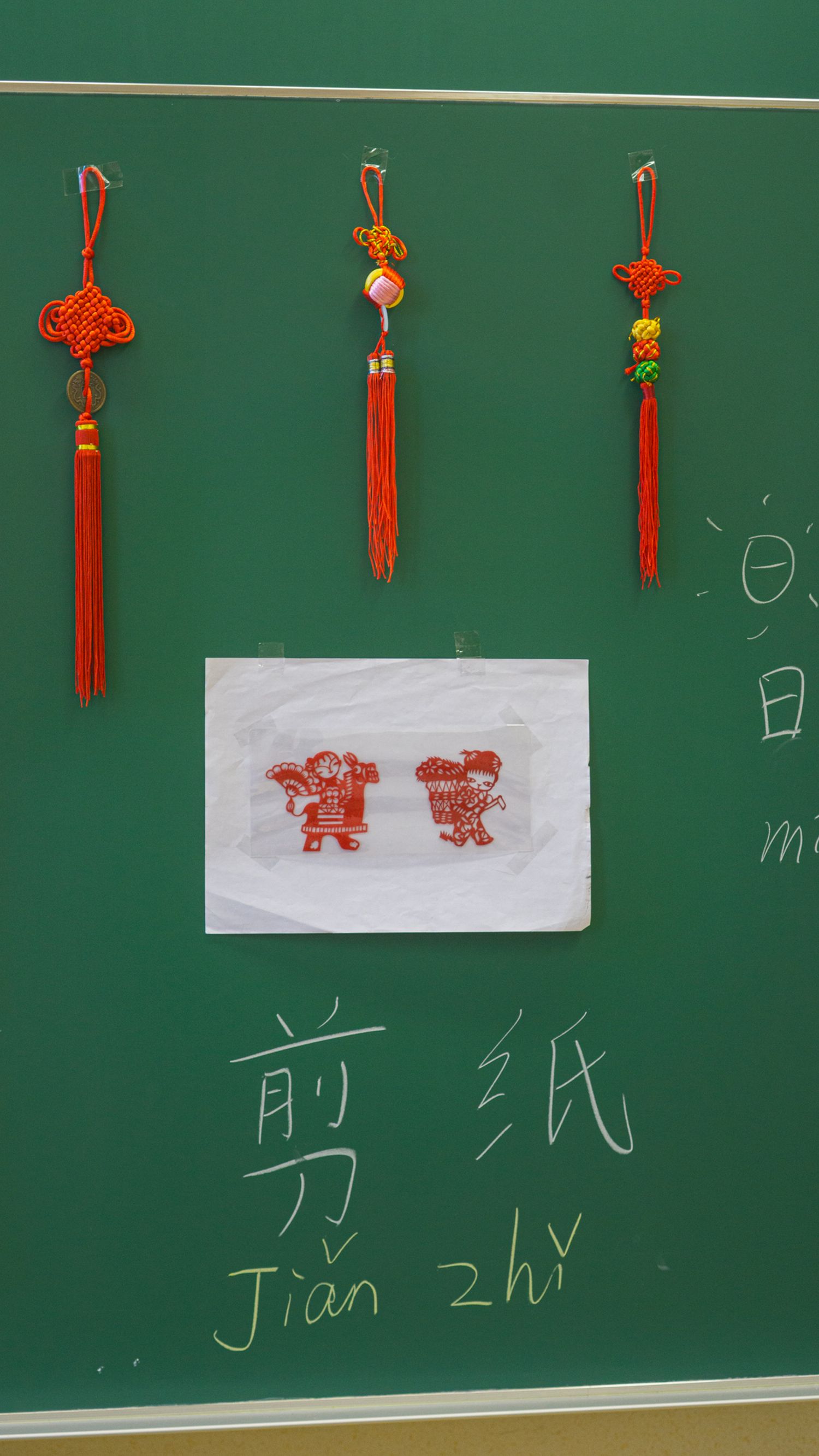 Eine weitere Station behandelte die chinesische Kunst und Kultur. Dabei stand die Scherenschnitt-Kunst als traditionelle Kunstform im Vordergrund. Die chinesische Lehrerin führte die Schülerinnen und Schüler in die Vielfältigkeit der Motive ein und gab einen Einblick in die chinesischen Schriftzeichen. Sie bereicherte den Projekttag mit Berichten und Erfahrungen aus ihrer Kindheit und Schulzeit. Die Kinder schnitten und klebten dann selbstständig das Motiv zum chinesischen Frühlingsfest und durften ihren Namen ins Chinesische übersetzen lassen.