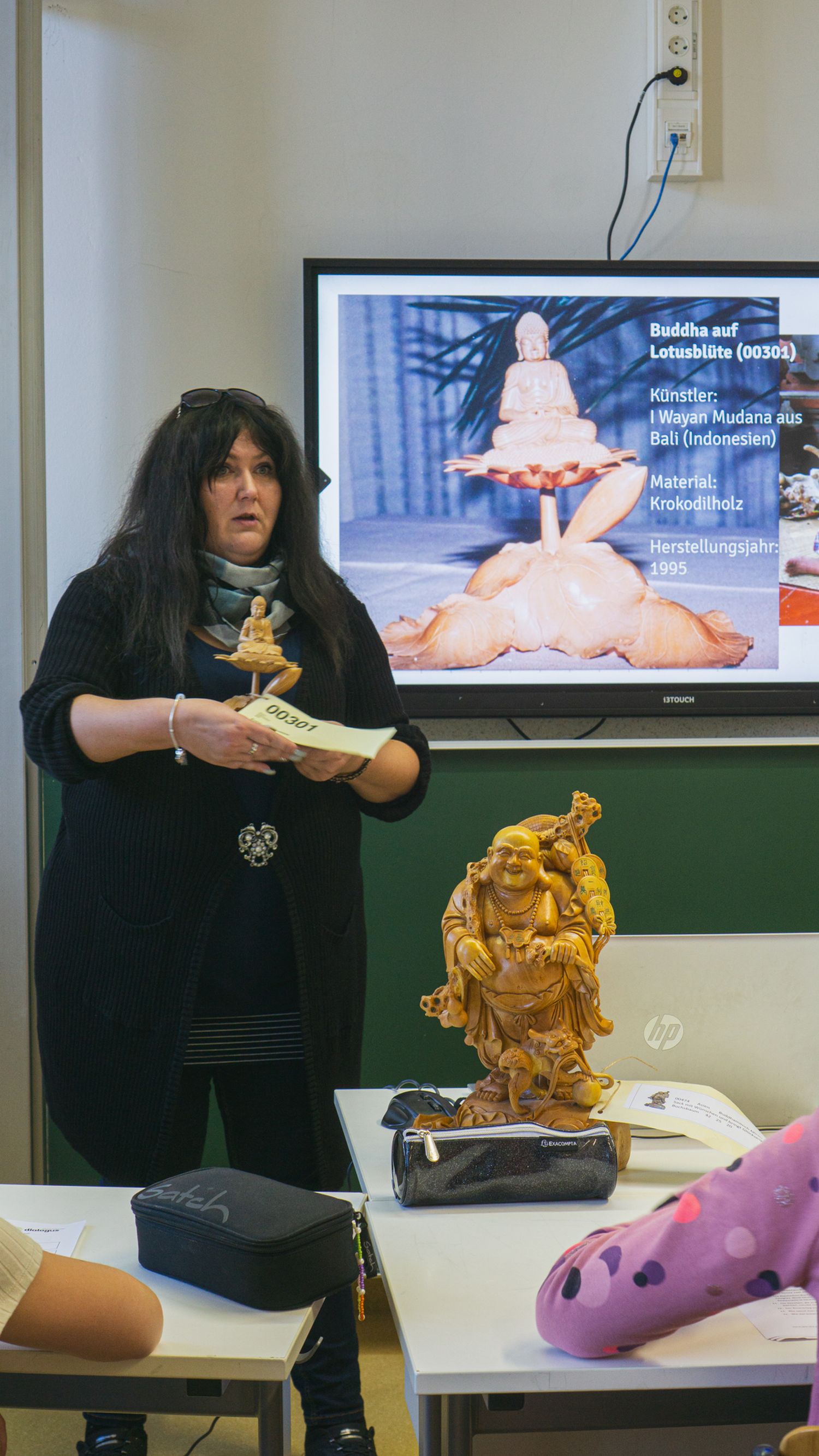 Die vierte Station stellte unterschiedliche Kunstobjekte aus China zur Schau. Dabei wurden historische Entwicklungen im Bezug auf Kolonialismus und damit verbunden die Beutekunst aus der Kolonialzeit aufgezeigt. Die Schülerinnen und Schüler zeigten großes Interesse an den unterschiedlichen Motiven und Materialien, die für die Kunstobjekte verwendet wurden.