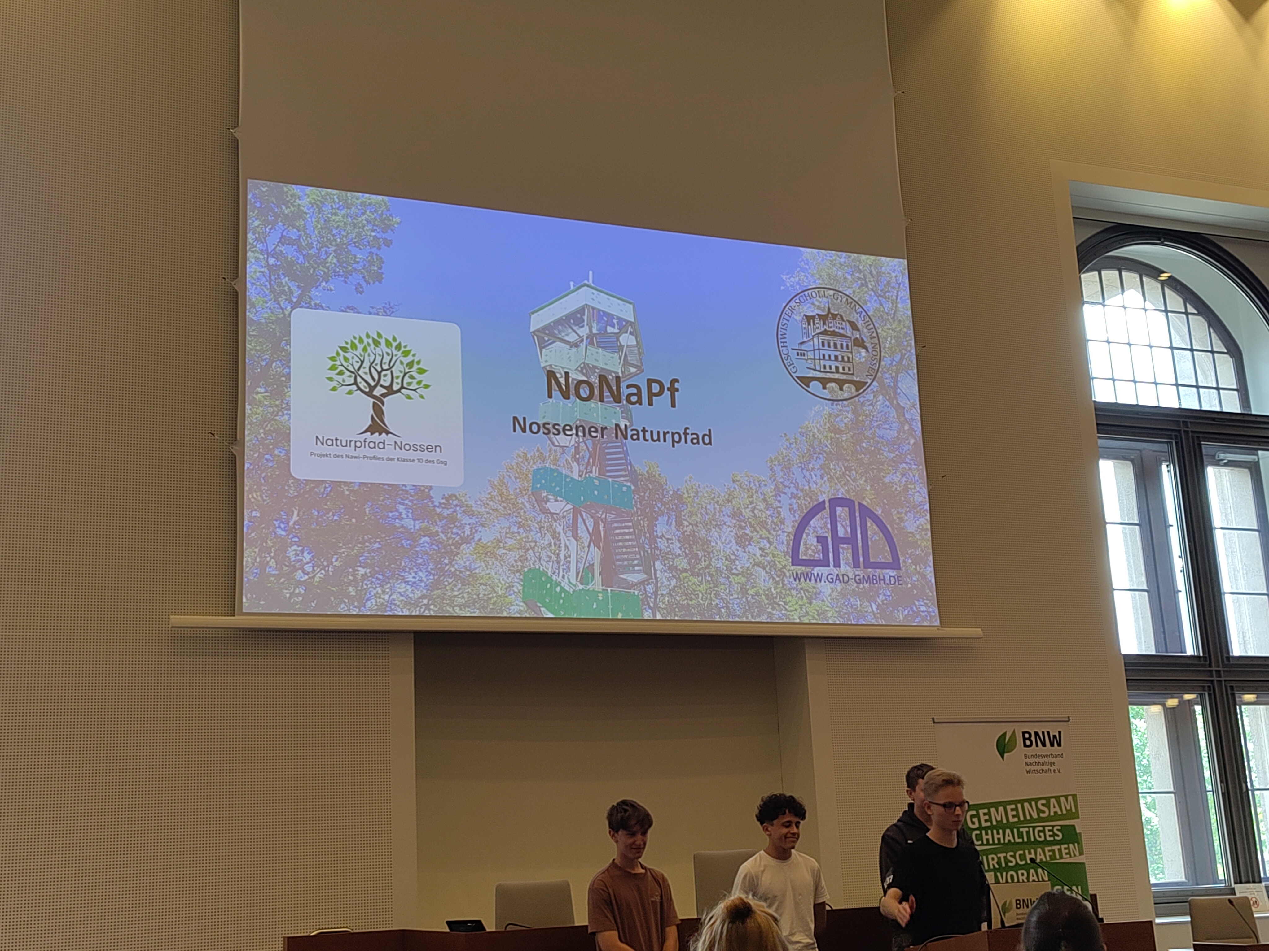 Seit Beginn des Schuljahres arbeitet eine Gruppe des NAT Profils 10 in Zusammenarbeit mit der GAD GmbH, der Stadt Nossen, des Sachsenforsts und des Bundesverbands für nachhaltige Wirtschaft e. V. am NoNaPf-Projekt, der Konzeption und Bau eines Naturpfades in Nossen. Für dieses aufwendige und anspruchsvolle Projekt wurde die Profilgruppe als „Umweltprofis von morgen“ im Leipziger Rathaus vom Bundesverband und dem sächsischen Staatsminister für Umwelt und Landwirtschaft Herrn Georg-Ludwig von Breitenbuch ausgezeichnet.