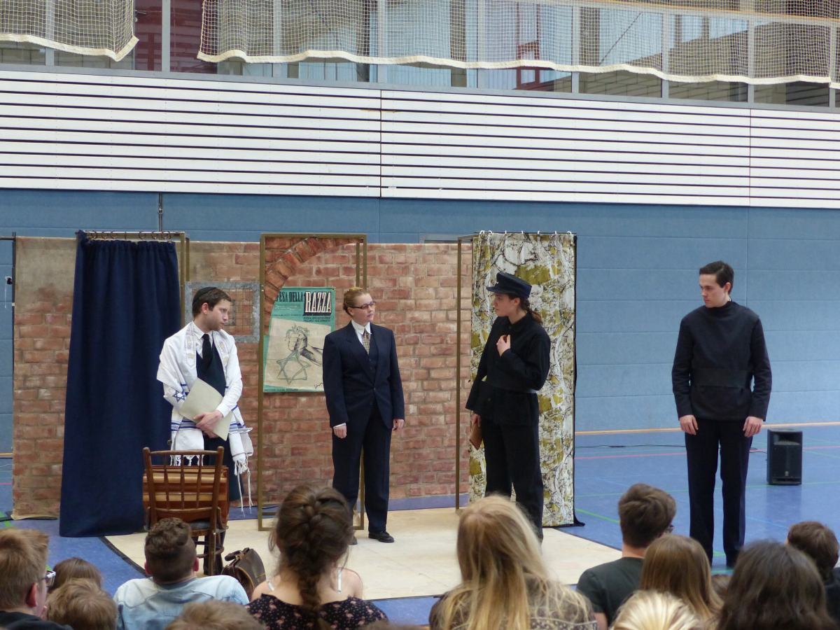 Das dritte Stück für die Oberstufe, „The Merchant of Venice“ von William Shakespeare, verlangte den Schauspielern noch einmal alles ab. Vielleicht nur einigen im Vorfeld bekannt ging es im weitesten Sinn um die Frage, inwieweit Moral und religiöse Vorurteile bei der Beurteilung eines Menschen und dessen Handlungen eine Rolle spielen. Antonio, ein Kaufmann aus Venedig, scheint seine Schiffe verloren zu haben und muss sich Geld borgen. Sein Freund Bassanio hilft ihm, beim jüdischen Geldverleiher Shylock Geld zu borgen. Pfand ist das Fleisch Antonios. Unter Mitwirkung von Portia, einer reichen Erbin, die eine Vermählung mit Bassanio eingeht, gelingt es letztendlich, Shylock dahin zu bringen, vom Einlösen des Pfandes Abstand zu nehmen und diesen selbst ins Unglück zu stürzen.