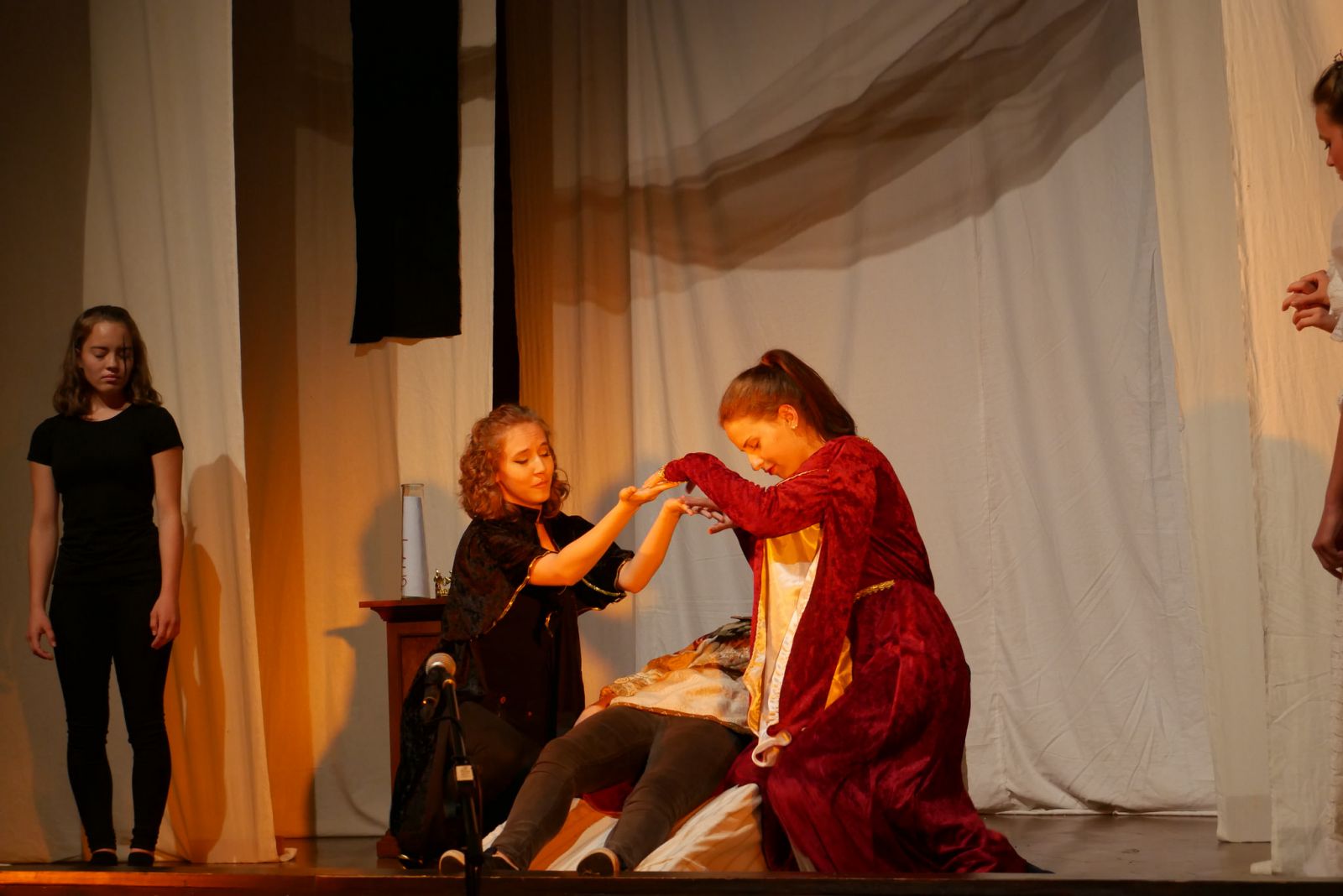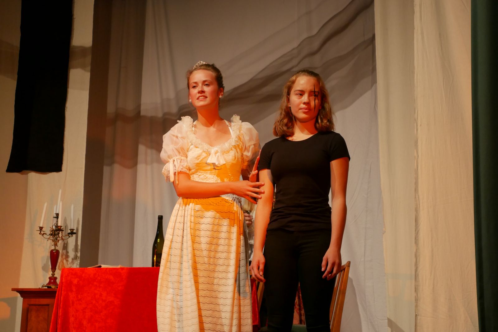 Nachdem wir uns durch den Wortsalat gefressen hatten, kam die Idee auf, dass man eine Rahmenhandlung einbinden könnte, in der ein Junge aus der heutigen Zeit vom Hamlet als Geist besucht wird. Dieser Junge heißt auch Hamlet! Schock, Horror! Nein, natürlich steckt da mehr dahinter. Die von uns sehr feierlichen getauften „junger Hamlet“ (Amelie Kluge) und „alter Hamlet“ (Leonie Bressel) gehen nun zurück in das 16. Jahrhundert und sehen sich an, wie Hamlets Leben zugrunde geht. Denn der junge Hamlet scheint vor dem selben Schicksal zu stehen, und der alte Hamlet versucht ihn von den Fehlern, die auch er begann, abzuhalten.