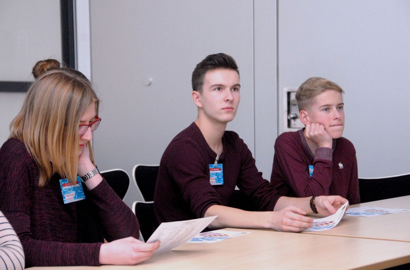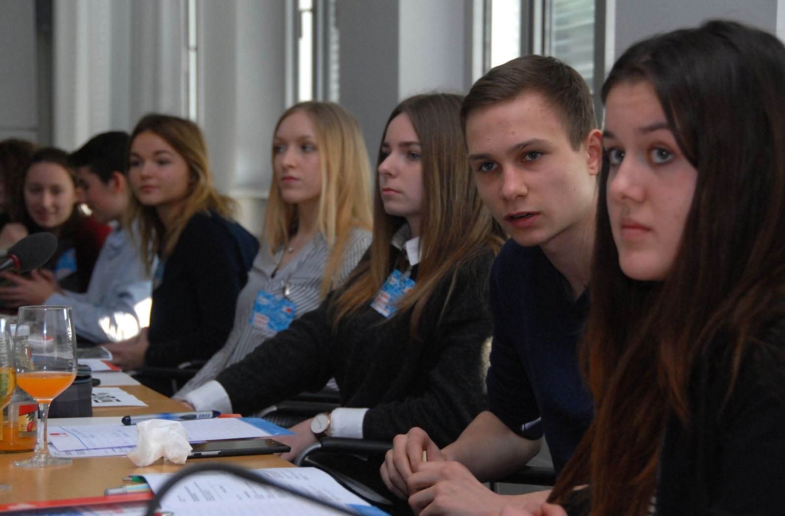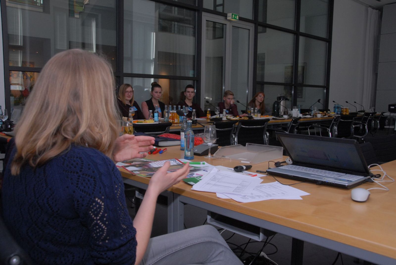 Kaum hatten wir den Veranstaltungsraum erblickt, wurde einer nach dem anderen von der super modernen Ausstattung, den langen Tischreihen, reich bedeckt von buntem Obst, frischen sowie heißen Getränken und auch exquisit belegten Brötchen, fasziniert und ergriffen. „Setzt euch und greift ruhig schon zu“, wurden wir begrüßt. Das ist wohl ziemlich schwierig umzusetzen, wenn man als erste Gruppe ankommt und nicht gleich von allen anderen als „Dorfgymnasium“ ohne jegliche Manieren abgestempelt werden will. Bald stießen auch die anderen Teilnehmer des Tages sowie Mitarbeiter der SPD zu uns. Nach einem kurzen Snack, weil die Brötchen vom Anschauen ja nicht besser werden, begannen wir den „offiziellen Aktionstag“ mit einer kleinen Vorstellungsrunde, bei der wir die Mikrofone an unseren Plätzen einweihten.
