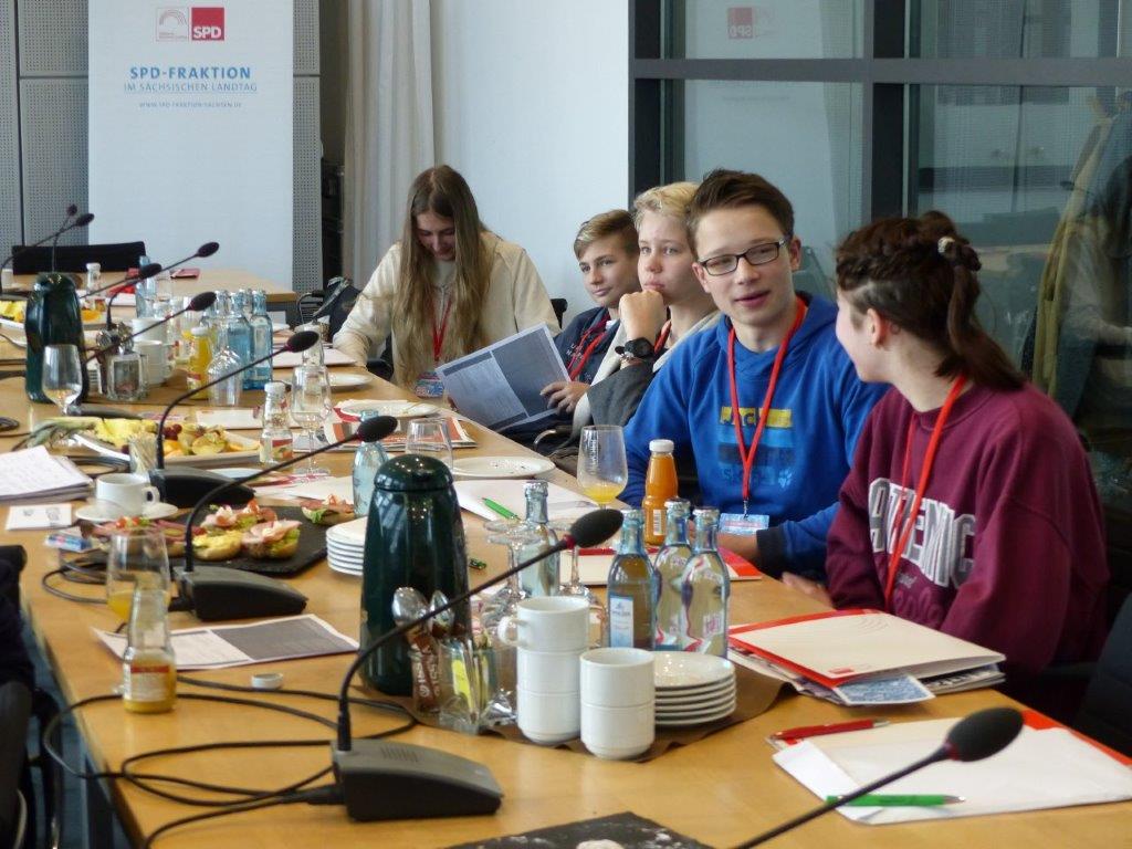 Pünktlich um Neun erreichten wir, die Reporter der Schülerzeitung, den Landtag und wurden gleich in die Etage der dort sitzenden Partei SPD befördert, nett begrüßt und aufgefordert, „schon mal zuzugreifen“. Ja, das Essen sah wirklich bezaubernd aus, aber noch bezaubernder war natürlich der Gedanke an die bevorstehenden 7 Stunden, welche wir mit der Jugendpresse und den Politikern verbringen durften.