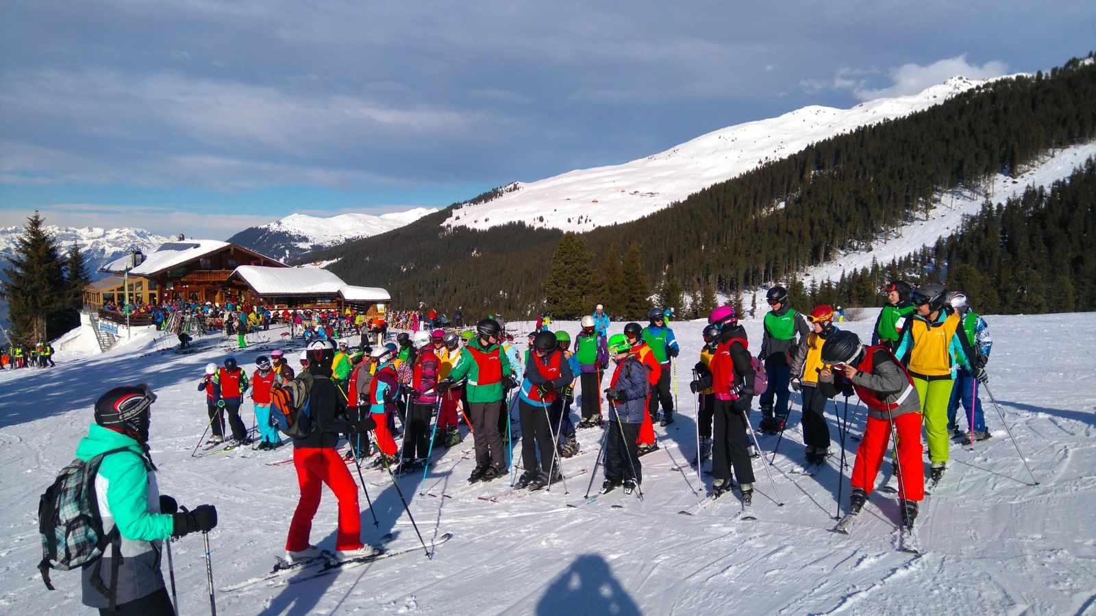 Am nächsten Morgen nach einem zeitigen Frühstück, hieß es dann Skisachen an und auf den Bus zur „Mittelstation“ warten. Dort angekommen bekamen wir unsere Skipässe und danach stiegen wir in die Gondeln zu den Skipisten. An der Mittelstation versammelten sich alle Gruppen um sich mit einer kleinen Erwärmung auf das Skifahren einzustimmen. Später gingen die Profis auf die schon etwas größeren Pisten, wohingegen die Anfängergruppen erstmal auf dem Kinderhügel blieben, um die ersten Grundkenntnisse zu erlernen.